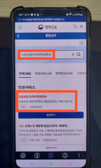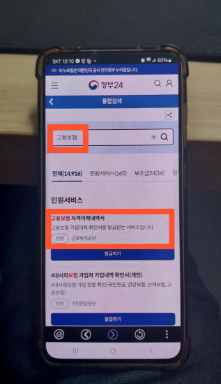 - 검색탭(돋보기)에서 '고용보험' 또는 '고용보험 자격이력내역서' 검색하기