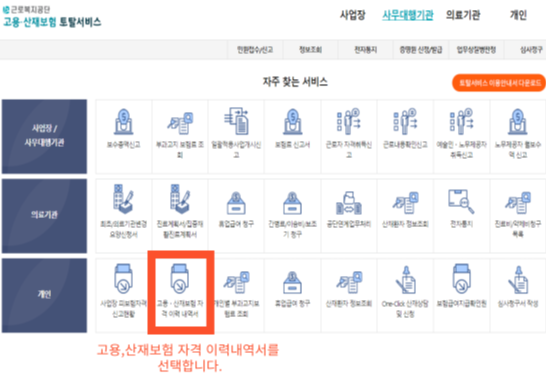 ▶개인 >> '고용, 산재보험 자격 이력내역서'를 선택합니다.