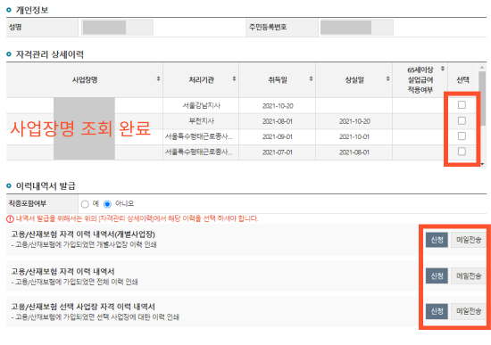 ▶사업장명, 취득일, 상실일을 확인하여 필요한 내용을 선택하여 신청합니다.