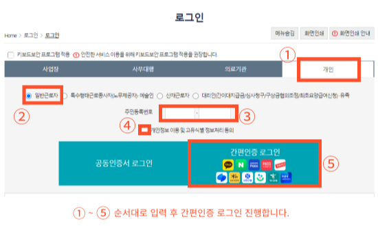 - 로그인하기 >> 개인 >>일반근로자 >> 주민번호입력 >> 정보동의 >> 간편 인증로그인
