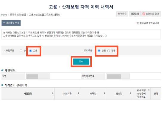 - 개인 >> 고용, 산재보험 자격이력내역서 클릭