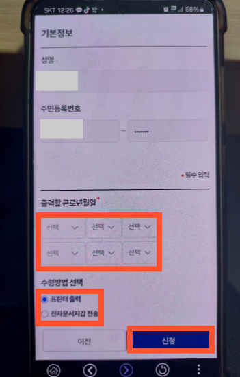 ▶출력할 근로년월일과 수령방법 선택을 통해 필요한 정보를 선택 후 신청합니다.