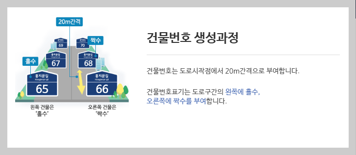 왼쪽은 홀수 / 오른쪽은 짝수로 지정하고 있으며, 전 세계적으로 보편화된 주소 체계 유형입니다.