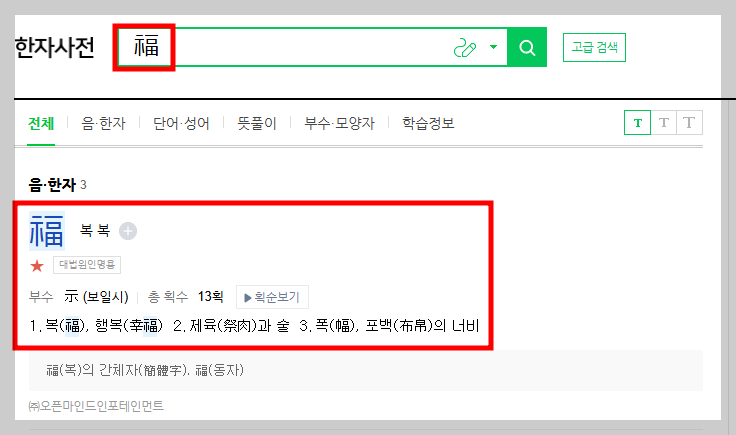 - "福(복 복)" 입력 → 뜻: 복, 행운 🍀 / 발음, 획수, 유의어, 예문까지 상세 확인 가능