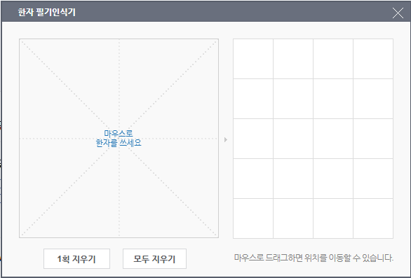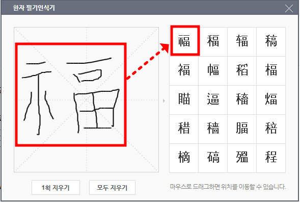 이 기능을 사용하면 손으로 직접 입력한 한자를 인식해 가장 유사한 한자를 찾아줍니다.