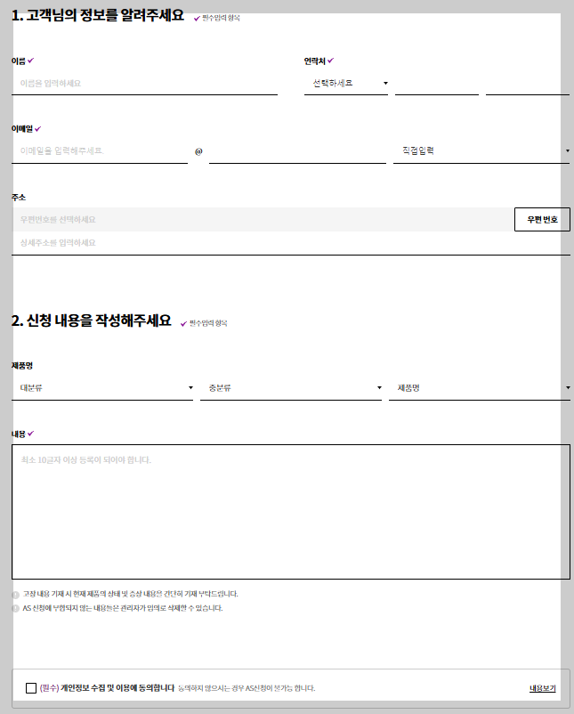 비회원으로 AS신청한 경우에는 신청만 가능하며, 접수 및 처리내역은 조회할 수 없습니다.