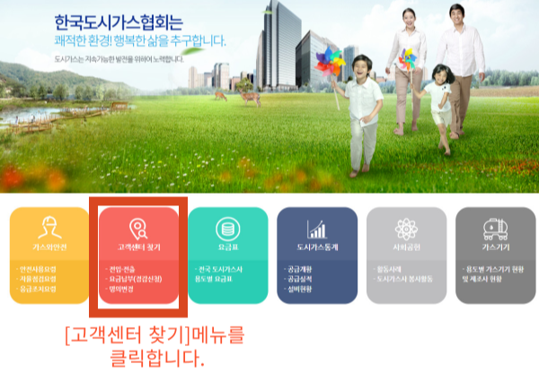 한국도시가스협회 홈페이지 메인 화면에서 "고객센터 찾기" 메뉴를 클릭합니다.