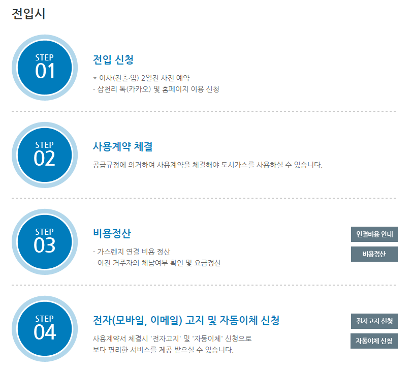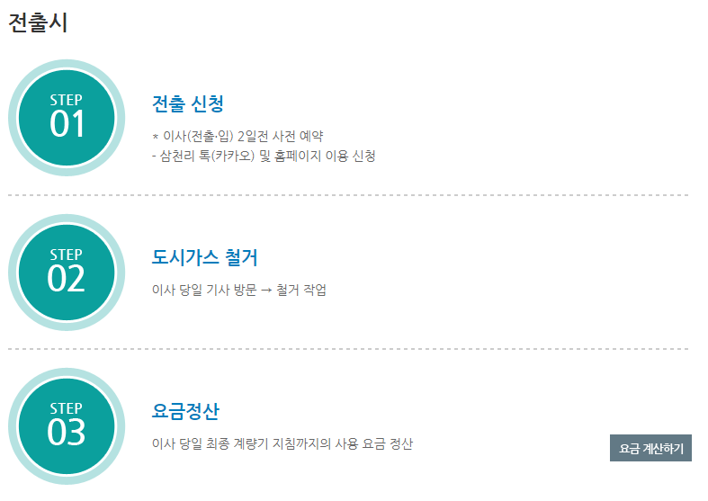삼천리 도시가스 홈페이지 or 삼천리 톡(카카오)을 이용하여 전출신청 가능합니다.