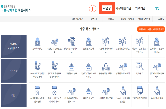 ▶②로그인하기 ("사업장/ 사무대행기관 의료기관 / 개인" 중 ①사업장을 선택합니다.)