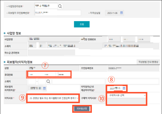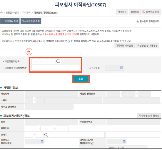 ▶⑥사업장관리번호, 피보험자 주민등록번호를 입력하고 조회합니다.
