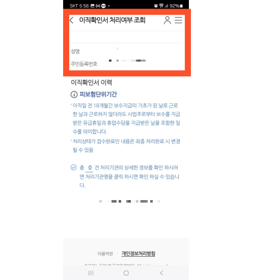 ▶"이직확인서 처리여부 조회"를 클릭하면 결과를 조회할 수 있습니다.