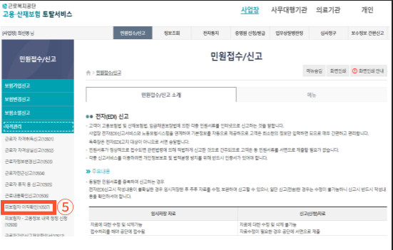 ▶"③민원접수 / 신고 >> ④자격관리 >> ⑤피보험자 이직확인" 순으로 이동합니다.