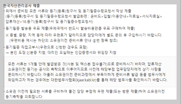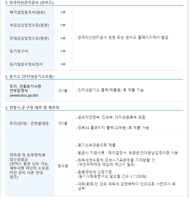 ▶소유권 이전에 필요한 서류를 준비합니다. 온비드 홈페이지에서 관련 안내를 확인할 수 있습니다.