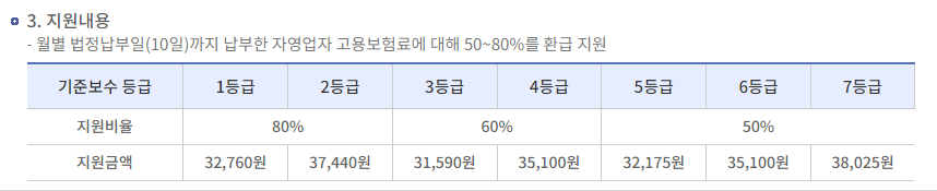 ※ 자영업자 고용보험료 납부보험료 일부(50~80%)를 최대 5년간 지원하고 있습니다.