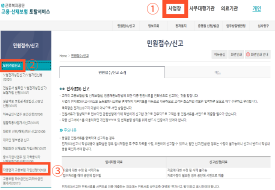 ▶①사업장 >> ②보험가입신고 >> ③자영업자 고용보험 가입신청 순으로 클릭