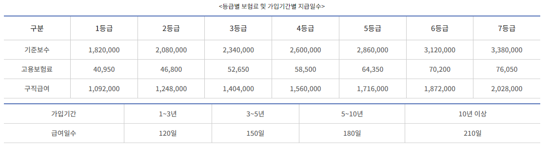 | 급여일수 | 120일 | 150일 | 180일 | 210일 |