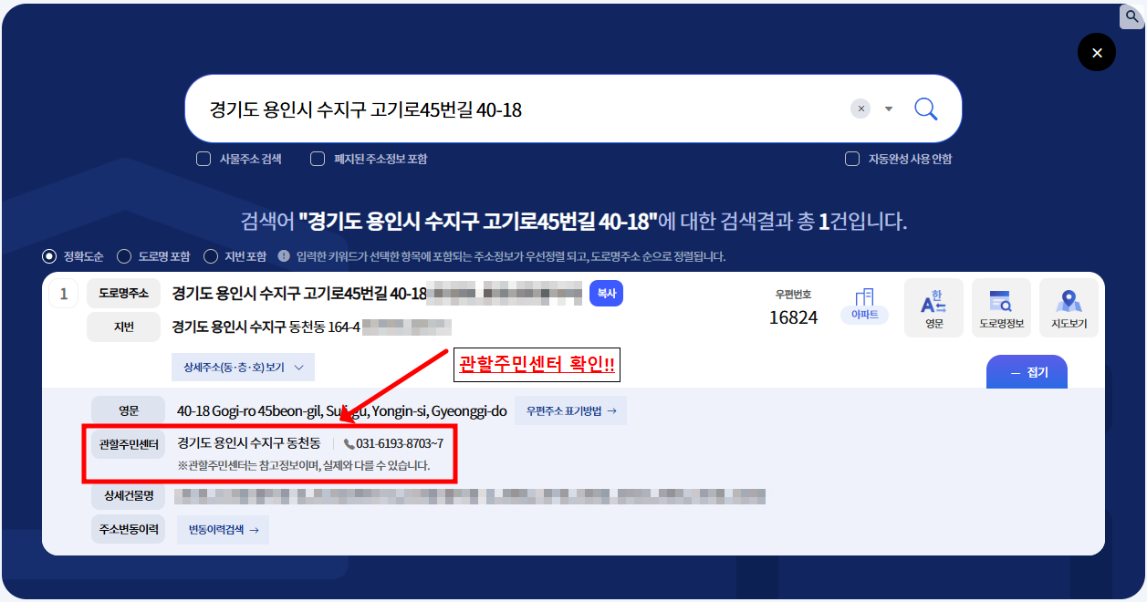 4️⃣ 아래와 같이 관할 주민센터 정보 확인하기