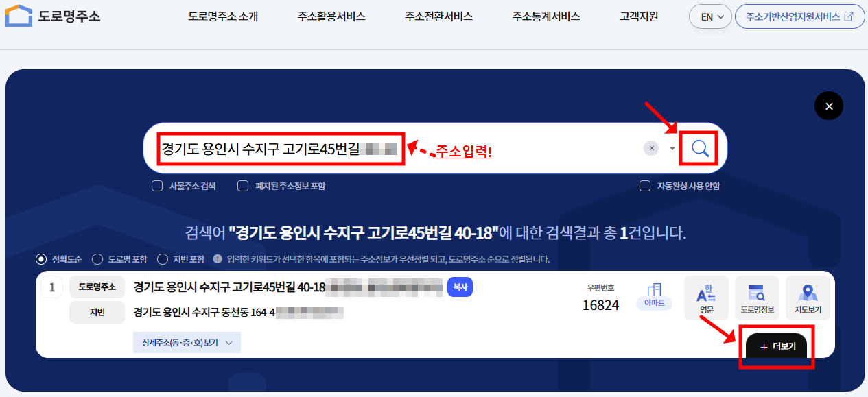 검색 결과가 나오면 도로명 주소 옆에 있는 ‘더보기’ 버튼을 클릭해 주세요.