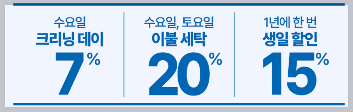 - 할인은 의류보관, 코인세탁에는 적용되지 않음.