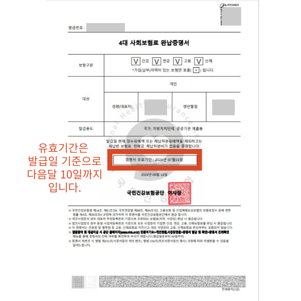 4대보험 완납증명서 유효기간은 발급일 기준으로 다음 달 10일까지입니다.