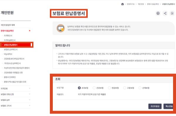 - "보험료 납부확인서" >> "보험료 완납증명서" 선택